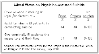 This month marks the ten year anniversary of Oregonians passing their physician aid in dying law. The Pew Forum has a report out that confirms this is still quite controversial. Hallelujah! The day doctors assisting in death becomes mainstream is the day I want my lethal prescription! This survey, from 2005 shows split views. Some two years later, people still have mixed views on supporting this ‘practice’. I’ve always said that euthanasia, physician assisted suicide, physician aid in dying, or whatever euphemism you want to attach to it, is the ultimate in patient abandonment. Yes, people do get sick and die however, we should not promote the intentional ending of life and then cover it up with words like ‘compassion’ and ‘dignity’. Palliative care – YES Killing – NO